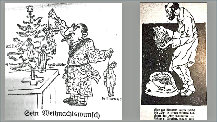 Besonders drastisch arbeitet der Stadtwächter mit karikierten Themen. In einer später, hier undatierten Karikatur wird „der Jude“ als jemand dargestellt, der die Finanzen des Rathauses plündert.Im darunter gesetzten Spottgedicht heißt es: