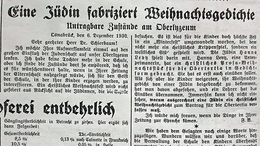 Häufig wird gegen Warenhäuser und Konsumvereine vor allem deswegen agitiert, da diese in jüdischer Hand seien. Es geht aber auch um den normalen republikanischen Alltag, den man aufs Korn nimmt. In der Nummer vom 12. Dezember 1930 wird von einem angeblichen , von einer Leserin übermittelten Skandal berichtet, dass am Mädchengymnasium „Lyzeum“ angeblich ein Weihnachtsfest aufgrund jüdischer Einflüsse ausfiele und eine jüdische Frau sogar Weihnachtsgedichte formuliere. Kurzum: Insbesondere die Hetze gegen Jüdinnen und Juden wird zu einem Identitätsmerkmal des Wochenblatts. Und Zuträgerinnen wie Zuträger für sein Hetzblatt findet Schierbaum immer wieder.