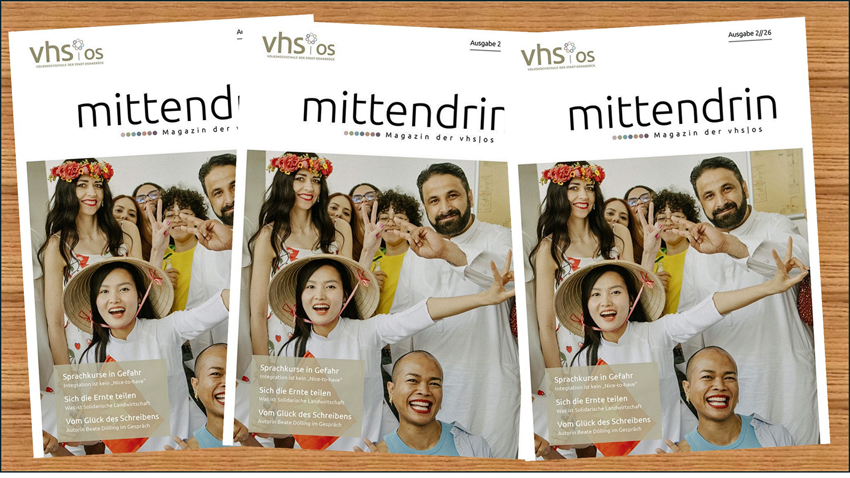Ob Kunst und Kultur, Fremdsprachen, politische Bildung, digitale Kompetenzen oder Gesundheit und Bewegung: „mittendrin“ zeigt die ganze Bandbreite der Angebote. Gleichzeitig erzählt das Magazin Geschichten aus der Praxis – von Teilnehmenden, Dozierenden und Gästen aus Lesungen und Vorträgen – und macht deutlich, was Lernen vor Ort bedeutet. So gibt es unter anderem ein Interview mit der bekannten Autorin Beate Dölling, ein Gespräch mit der EDV-Dozentin Julia Altenau über Kurse für Frauen ab 50, einen Beitrag zur Solidarischen Landwirtschaft sowie Berichte von Dozierenden und Teilnehmenden aus dem Bereich Deutsch als Zweitsprache über ihre Kurse und Erfahrungen.