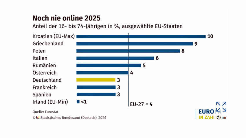 Deutschland bewegt sich im klassischen Trend: Im Durchschnitt innerhalb der Europäischen Union (EU) lag der Anteil der Offliner laut der EU-Statistikbehörde Eurostat im Jahr 2025 bei 4 %. Aber zwischen den einzelnen EU-Staaten gibt es drastische Unterschiede: In Irland, den Niederlanden, Schweden und Luxemburg gaben weniger als 1 % der 16- bis 74-Jährigen an, noch nie das Internet genutzt zu haben. Die vier Länder besitzen also eine fast vollständige Nutzer*innen-Quote. Die höchsten Anteile an Offlinern verzeichnen dagegen Staaten wie Kroatien und Portugal, wo jeweils rund 10 % ohne Internet lebt.