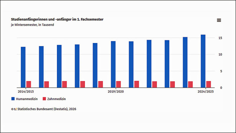 Die Dentist*innen-Quote lag im Wintersemester 2024/2025 mit knapp 2 000 Studierenden lediglich um 1 % über der im Wintersemester 2014/2015. Das alles ist besonders bemerkenswert, weil die Studi-Zahlen andernorts abnehmen: Zum Vergleich: Die Zahl der Studienanfängerinnen und -anfänger im 1. Fachsemester ist über alle Fächergruppen hinweg im selben Zeitraum um 3 % gesunken auf 651 000 im Wintersemester 2024/2025. Kurzum: Medizin zählt zu den positiven Trend-Fächern.