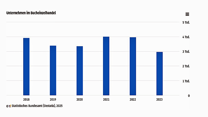 Es ist eine dramatische Zahl, die Lesende nachdenklich stimmen sollte: Die Zahl der Bucheinzelhändler in Deutschland ist auf einen neuen Tiefstand gesunken. Gut 2 980 solcher Einzelhandelsunternehmen gab es im Jahr 2023. Das entspricht einem Rückgang um knapp ein Viertel (24 %) innerhalb von fünf Jahren, wie das Statistische Bundesamt (Destatis) anlässlich der Frankfurter Buchmesse vom 15. bis 19. Oktober mitteilt.