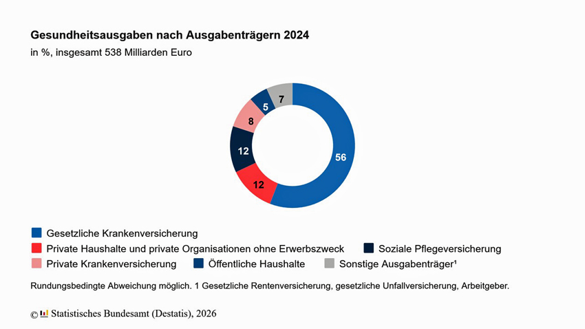 Die Gesundheitsausgaben in Deutschland beliefen sich im Jahr 2024 auf 538,2 Milliarden Euro. Das waren 6 444 Euro je Einwohnerin und Einwohner. Wie das Statistische Bundesamt (Destatis) zum Weltgesundheitstag am 7. April 2026 weiter mitteilt, stiegen die Gesundheitsausgaben insgesamt um 37,9 Milliarden Euro oder 7,6 % gegenüber 2023. Der Anteil der Gesundheitsausgaben am Bruttoinlandsprodukt (BIP) lag 2024 bei 12,4 % und damit 0,6 Prozentpunkte höher als im Vorjahr.