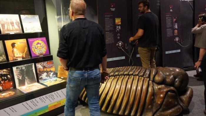 Neben den um ein Vielfaches vergrößerten Fossilien sind in der Ausstellung noch eine ganze Menge Infos über die verewigten Rockstars zu sehen in Form von z.B. Plattencovern und zu Hören an Hörstationen.
