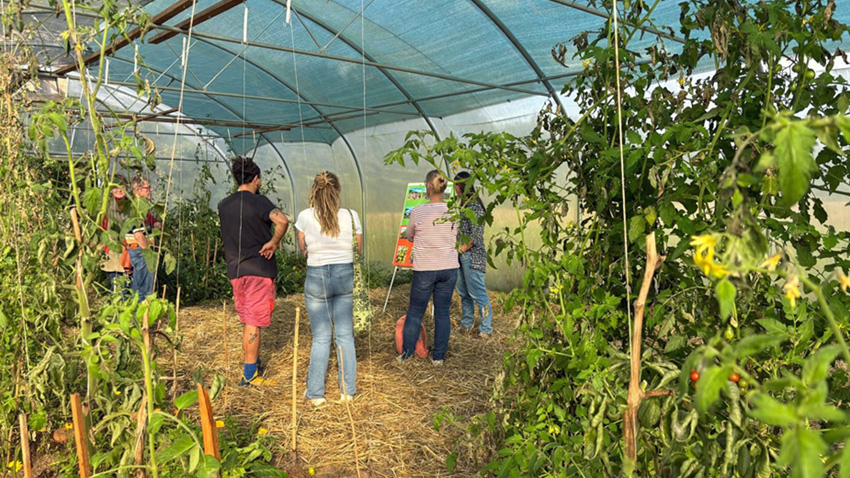 An der ersten Station erläuterte Angelika, wie der neue Folientunnel gemeinsam aufgebaut wurde und welche Erfahrungen dort bisher mit den angebauten Tomaten, Zucchini, Paprika, Gurken, etc. gemacht wurden.