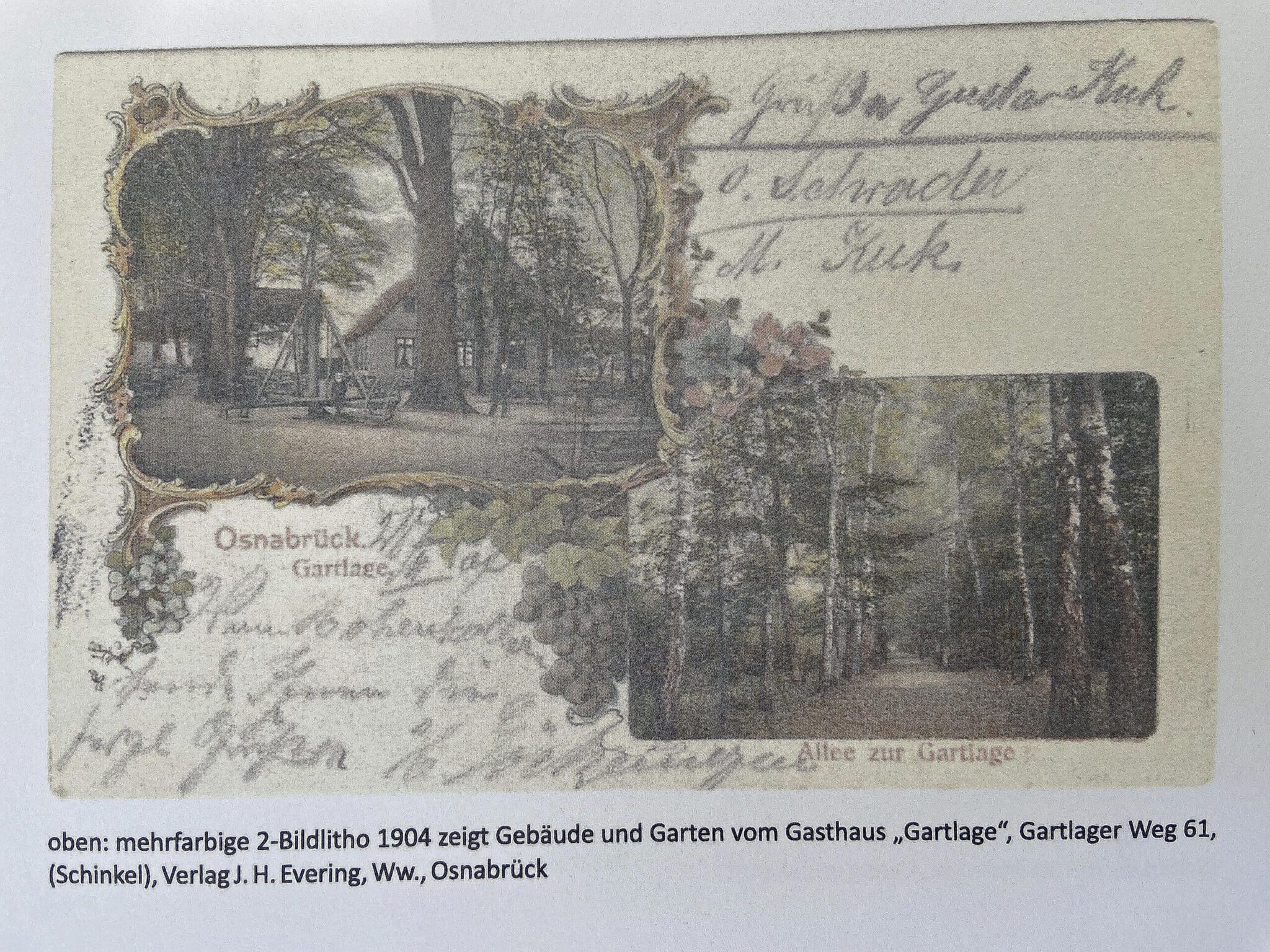 Mehrfarbige Zweibildlitho von 1904. Gezeigt werden Gebäude und Garten, Gartlager Weg 61. Verlag: H. Evering Wwe, Osnabrück