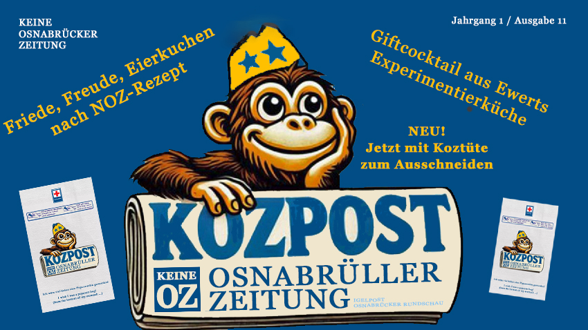 Nun aber hat sich der Chefredakteur in der Print-Ausgabe vom 11. Oktober, online schon am Vortage zu lesen, selbst getoppt. Originalton: „Trump hätte den Friedensnobelpreis verdient“ prangt als Leitkommentar auf der ersten Printseite. Gern darf man, bevor man der KOZ-Post folgt, vorab den kompletten Wortlaut studieren. Wir sind zwar tolerant,  dennoch wurden für unsere täglich wachsende Leser*innenschaft 50.000 KOZ-Tüten prophylaktisch in Auftrag gegeben.