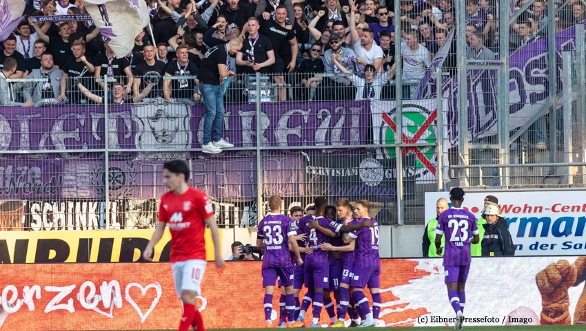 Start Jubel Osnabrueck vor den eigenen Fans nach Tor zum 0:1 durch Ba-Muaka Simakala (Osnabrueck, 11), Hallescher FC vs. VfL O Jubel Osnabrueck vor den eigenen Fans nach Tor zum 0:1 durch Ba-Muaka Simakala (Osnabrueck, 11), Hallescher FC vs. VfL O