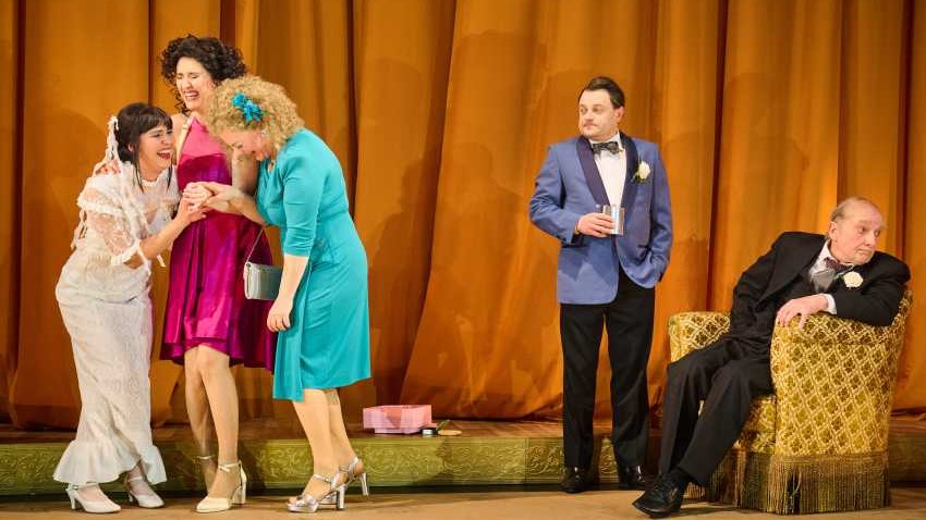 Dieser Humor wird so manches Mal auf die Spitze getrieben und gleitet hin und wieder ab ins Zotige, besonders am Morgen, als die Schwestern (Lua Mariell Barros Heckmanns, Verena Maria Bauer und Monika Vivell) mit ihrer Tante Carol (Sascha Maria Icks) bei der Morgentoilette zum Fest zusammensitzen, sorgt aber für reichlich Lacher im Publikum.