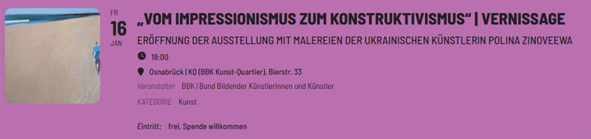 Die Ausstellungsdauer wird sich im Zeitraum zwischen dem 16. Januar bis 7. März 2026 erstrecken: Vom Licht zur Struktur, vom Augenblick zur Form, so beschreibt Polina Zinoveeva ihren künstlerischen Prozess, bei dem es um die allmähliche Wandlung von Emotion zu Logik, von Zufall zu Ordnung geht. In ihrer neuen Ausstellung „Vom Impressionismus zum Konstruktivismus“ führt die ukrainische Künstlerin die Besucher:innen hinein in diesen Transformationsprozess, der zugleich Rückschau und Neubeginn ist.