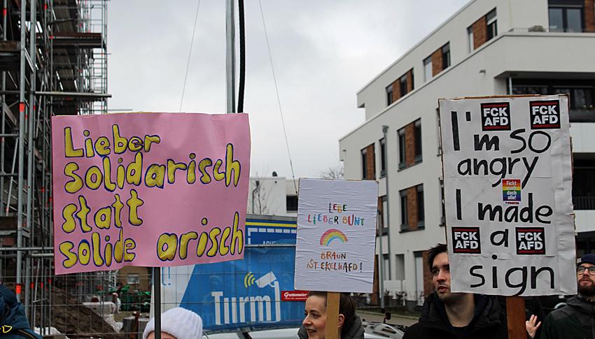 „Kein geheimes Treffen mehr“, lautete die Botschaft auf einem Protestschild. Die Protestierenden wurden immer mehr. Man sprach viel miteinander und es sprach sich herum, im Stadtteil. Weitere Schilder zeugten davon. Schließlich waren es über hundert. Singend oder mit Trillerpfeifen sorgten sie dafür, gehört zu werden. In die Sporthalle hatten sich nur sehr wenige geschlichen.
