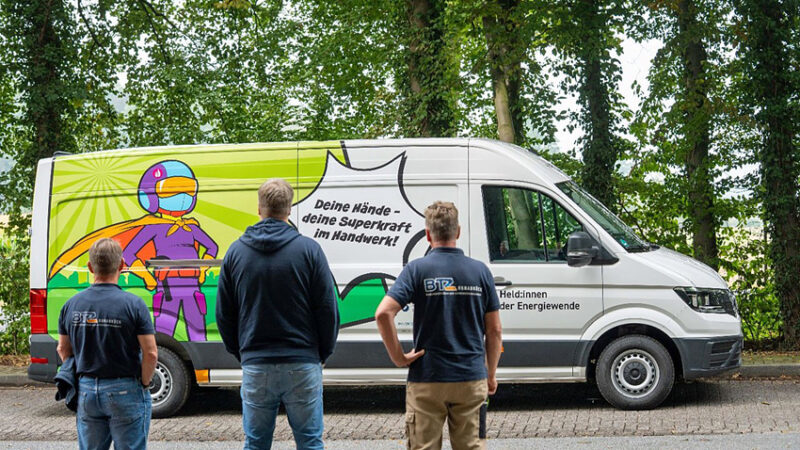 Peter Ostendorf und Uwe Klenke besteigen zu Dienstbeginn ihre speziell ausgebauten 3,5 Tonner mit auffälliger Superhelden Comic-Lackierung. Die beiden Lehrwerkmeister der Handwerkskammer machen sich auf den Weg zu einer Schule im Stadtkreis Osnabrück, um Schülerinnen und Schülern der zehnten Jahrgangsstufe Grundkenntnisse im Bau- Ausbauhandwerk sowie der Versorgungstechnik zu erläutern. In den Transportern liegt alles bereit: Werkbänke, Werkzeug und Materialien. Ruck zuck ist auf dem Schulhof bei bestem Wetter alles aufgebaut und es kann losgehen.