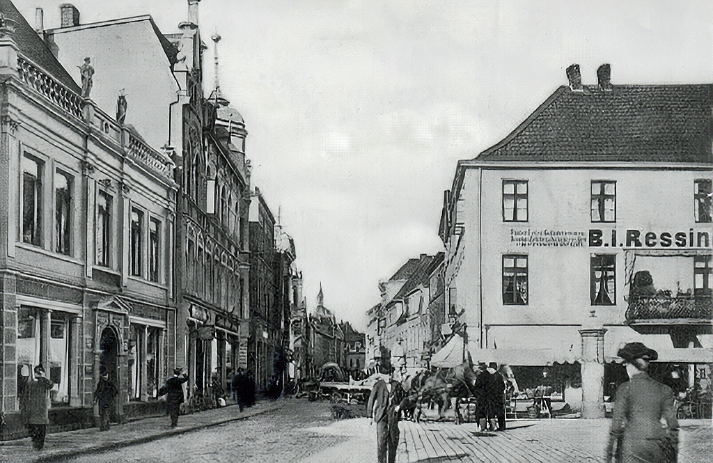 Rechts: Papierhandlung B. I. Ressing. Große Straße 1