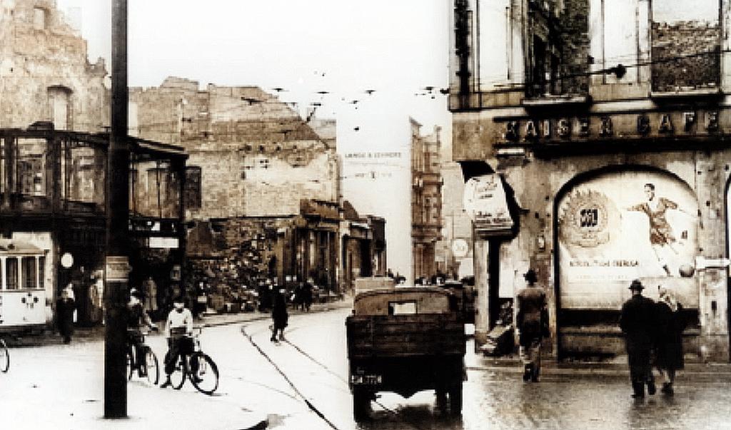 So sah der Nikolaiort 1949 aus und eine Wandbemalung weist etwas verloren und bescheiden auf das 50-jährige VfL-Jubiläum hin.