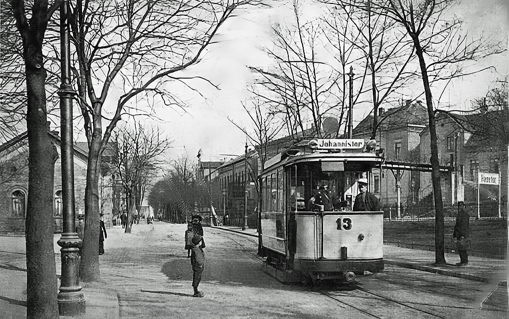 Straßenbahn der ersten Baureihe mit offenem Führerstand an der Endstation Hasetor (Linie 2)