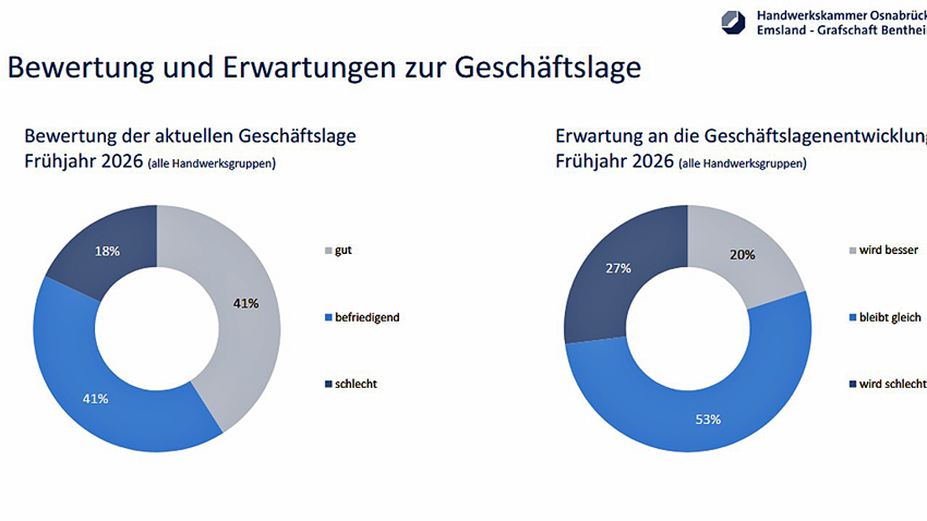 Die Stimmung unter den Handwerksbetrieben in der Region Osnabrück-Emsland-Grafschaft Bentheim bleibt unverändert, auch wenn die Rahmenbedingungen zunehmend schwierig werden. Die Frühjahrsumfrage der Handwerkskammer zeigt nun, dass sich das Geschäftsklima unter den Mitgliedsbetrieben stabil auf leicht positivem Niveau bewegt. „Trotz internationaler Unsicherheiten trotzt die Handwerkskonjunktur der Krise – ein echter Aufschwung ist aber nicht absehbar“, so die Einschätzung von Peter Beckmann, Geschäftsführer des Dezernats Betriebsberatung und Strukturförderung.