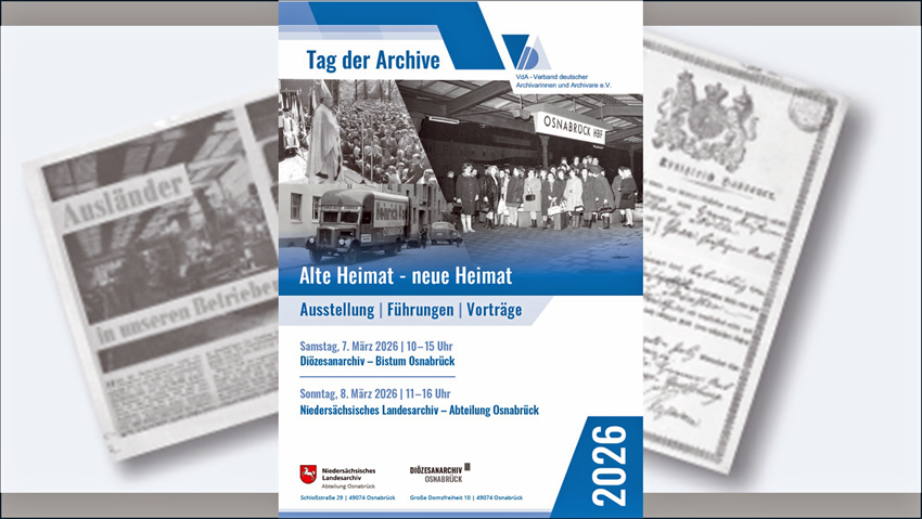 Am 7. und 8. März 2026 öffnen das Diözesanarchiv Osnabrück und die Abteilung Osnabrück des Niedersächsischen Landesarchivs ihre Türen zum bundesweiten 13. Tag der Archive. Unter dem gemeinsamen Motto „Alte Heimat – neue Heimat“ laden die beiden Archive alle Neugierigen ein, Geschichte zu entdecken, Quellen zu befragen und ins Gespräch zu kommen. Der Aktionstag macht die Rolle von Archiven als Orte des Erinnerns und Forschens sichtbar und bietet ein abwechslungsreiches Programm für Familien, Schülerinnen und Schüler, Forschende und alle, die sich für Erinnerung, Integration und regionale Identität interessieren.