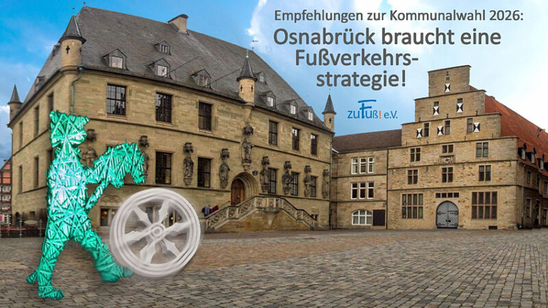 Wir möchten Sie damit auf vorrangige Verbesserungsnotwendigkeiten für den Fußverkehr in Osnabrück hinweisen und freuen uns, wenn Sie unsere Empfehlungen in Ihre Wahlprogramme einbeziehen.