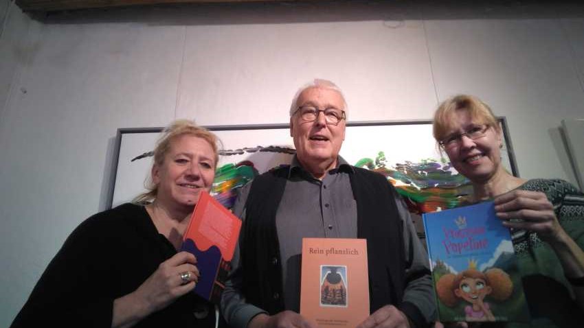 Tina Schick und Kerstin Broszat waren dieses Mal mit Kuchen zum Kaffeetrinken in den KulturRaum des Kulturvereins Bissendorf eingeladen, bei dem Michael Thomsen Pressewart ist, und konnten bei dieser Gelegenheit die aktuelle Ausstellung bewundern – endlich alles zusammen: Buch und Kunst und Kuchen!