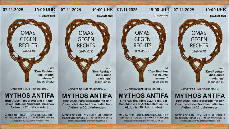 In der Mensa der Haupt- und Realschule Bramsche, Heinrichstraße 7, wird es am 7. November 2025 um 19 Uhr einen Vortrag mit anschließender Diskussion zum Thema „Mythos Antifa? – Eine Auseinandersetzung mit der Geschichte der Antifaschistischen Aktion im 20. Jahrhundert“ geben. Eingeladen dazu haben die „Omas Gegen Rechts Bramsche“ und die Antifaschistische Mitmach-Kampagne „Den Rechten die Räume nehmen“ aus Osnabrück.