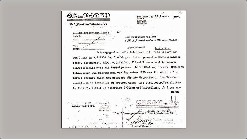Ein Dokument aus den Papieren der NS-Kreisleitung, die dem verstorbenen Historiker Dr. Volker Issmer in Kopie vorgelegen haben, scheint offensichtlich im Entnazifizierungsverfahren Unfugs nicht bekannt gewesen sein. Es handelt sich um ein Schreiben der SA-Standarte 78, das von Karl Unfug als „Fürsorgereferent der Standarte 78“ unterschrieben und an das Kreispersonalamt zu Händen von Obersturmbannführer Heidt gerichtet ist. Daraus geht hervor, dass die NSDAP dem Oberbürgermeister Dr. Gaertner bereits die „Parteigenossen Hesse, Hebestreit, Hörr, v.d.Heiden, Alfred Tiemann und Wachsmann“ für die Ernennung zu Beamten „vorgeschlagen“ habe. Nun „wären noch die Parteigenossen Adolf Wächter, Hömmen, Debusson, Schwarzmann und Schwammborn, die vor September 1930 den Eintritt in die Partei erklärt haben und deswegen für die Übernahme in das Beamtenverhältnis in Vorschlag zu bringen.“