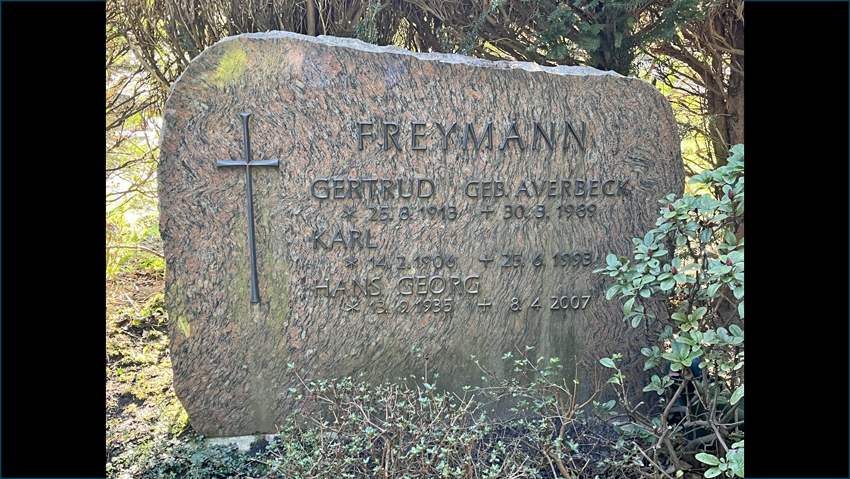 Grabstein für Karl Freymann (Unfug), seine Frau Gertrud und deren Sohn Hans auf dem Heger Friedhof