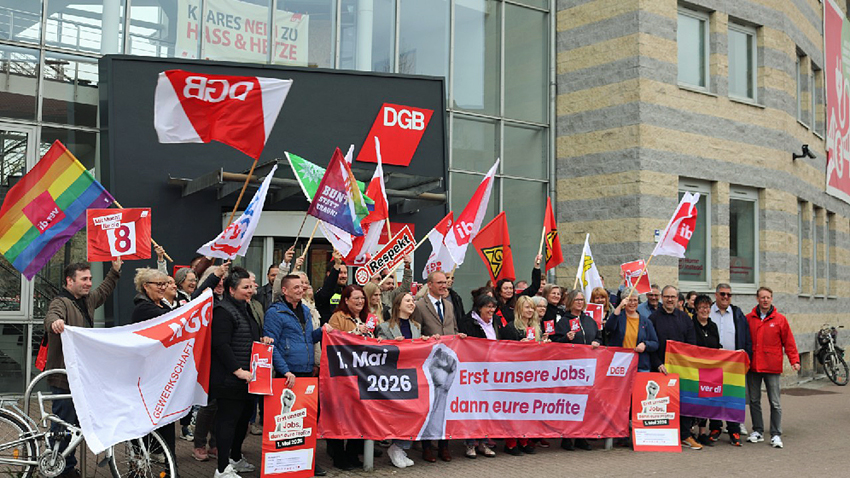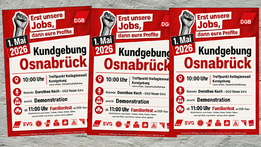 Die Osnabrücker DGB-Gewerkschaften formulieren am „ihrem“ Feiertag wie alle deutschen Kolleginnen und Kollegen das exakt richtige Zeichen: Unter dem kämpferischen Motto „Erst unsere Jobs, dann eure Profite“ setzt man, wie es wörtlich im Aufruf heißt, „ein unüberhörbares Zeichen gegen soziale Kälte und unternehmerische Profitgier. Angesichts von drohenden Standortverlagerungen und Betriebsschließungen, Angriffen auf den 8-Stunden-Tag und einer unsicheren Rentenzukunft rufen die Gewerkschaften die Beschäftigten der Region zur gemeinsamen Demonstration auf.“