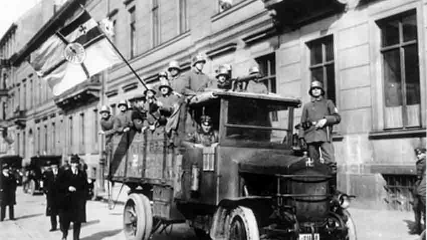 Berliner Beobachtern springt auf dem Stahlhelmen etlicher Putsch-Soldaten ein eigentümliches Symbol ins Auge: Es handelt sich um ein weiß gepinseltes Hakenkreuz. Den Hintergrund dieser altgermanisch anmutenden Bemalung kennen nur Insider: Träger der Hakenkreuzhelme sind antisemitische, antidemokratische und bei Nachkriegskämpfen um Grenzverschiebungen im Baltikum kampferprobte Mitglieder der Freikorps-Brigade Erhardt. Alle schmücken sich stolz mit dem späteren Erkennungszeichen der Nationalsozialisten. Überaus gern grölen sie ihr Erkennungslied: