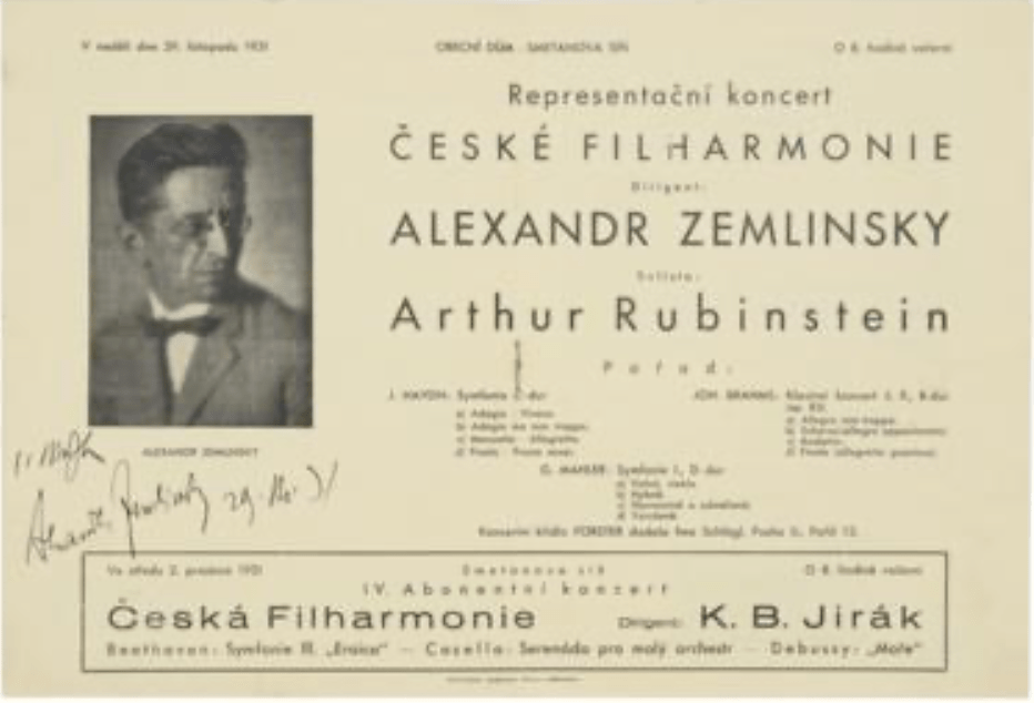 Ab 1923 ist Zemlinsky daneben Gastdirigent bei der Tschechischen Philharmonie, Viktor Ullmann ist hier sein Chordirigent, und er bringt oft Gustav Mahler zur Aufführung, aber nie Alexander Zemlinsky. Zemlinsky kann sich nicht gut verkaufen, er ist bescheiden, tritt hinter die Werke zurück, er hat keine „Ellenbogen“ und ihm fehlt die „Rücksichtslosigkeit“ (so sagt Adorno).