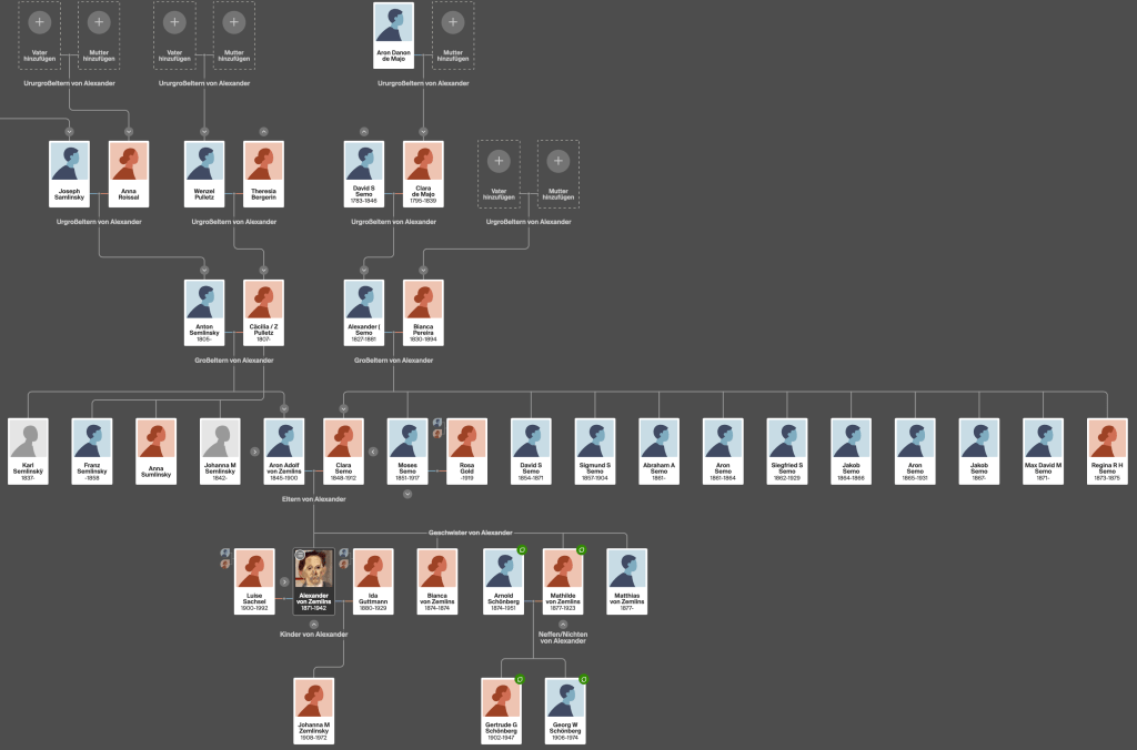 1871. Alexander (von) Zemlins(z)ky, unser Komponist, zeitlebens „Alex“ genannt, wird pünktlich neun Monate nach der Heirat von Adolf Z. und Clara Semo am 14. Oktober 1871 in der elterlichen Wohnung in der Odeongasse 3, in der Wiener Leopoldstadt geboren und laut Matrikel-Eintrag eine Woche später von einem Dr. Knöpfelmacher beschnitten. (Das „z“ streicht er später aus seinem Namen und nach dem Ersten Weltkrieg auch das „von“). 1874 kommt seine Schwester Bianca zur Welt, stirbt aber nach wenigen Wochen, und 1877 folgen die Zwillinge Matthias und Mathilde (später Arnold Schönbergs erste Frau).