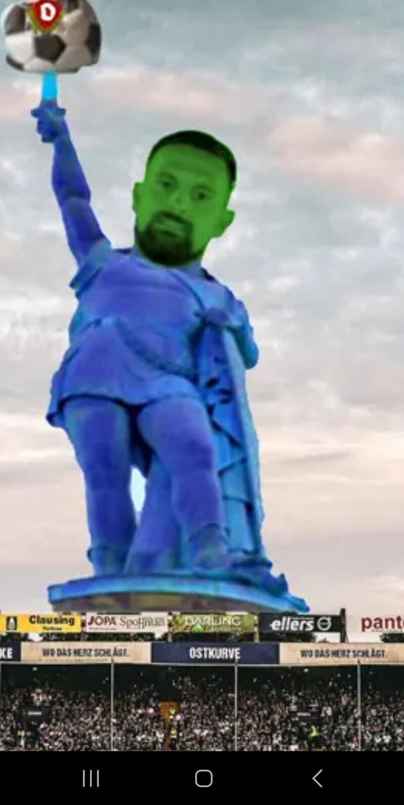 Der alles entscheidende Schritt wurde gestern Nacht vollzogen – offenkundig völlig unbemerkt von der schlafenden Nachbarschaft, aber in Anwesenheit der verständnisvoll wegschauenden Polizei: Direkt über dem Eingang zur Ostkurve erhebt sich nun ein markantes Denkmal, das weit über die Flutlichtmasten hinweg in die Höhe ragt und schon jetzt allein durch seine einmalige Hulk-meets-Star-Wars-Illumination den ollen Grau-in-Grau-Hermann in Ostwestfalen weit in den Schatten stellt.