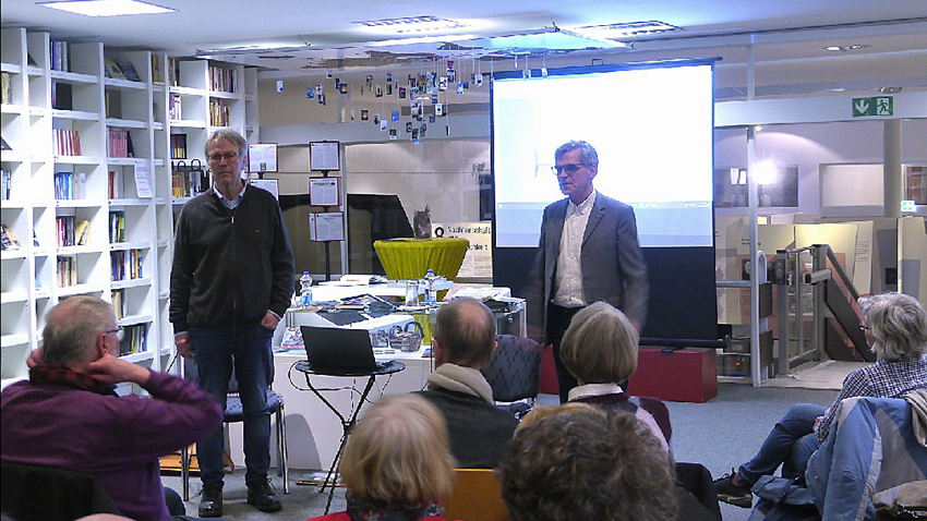 Anstelle einer klassischen Autorenlesung setzten der Vorsitzende der Erich-Maria-Remarque-Gesellschaft, Bernd Stegemann, und dem Leiter des Friedenszentrums, Dr. Sven Jürgensen, auf einen offenen Dialog mit dem Publikum. Anlass des Abends war die Veröffentlichung des neuen Forschungsbandes der Remarque-Jahrbuch mit dem Titel „Einsamkeit und Nähe“, von Claudia Junk.