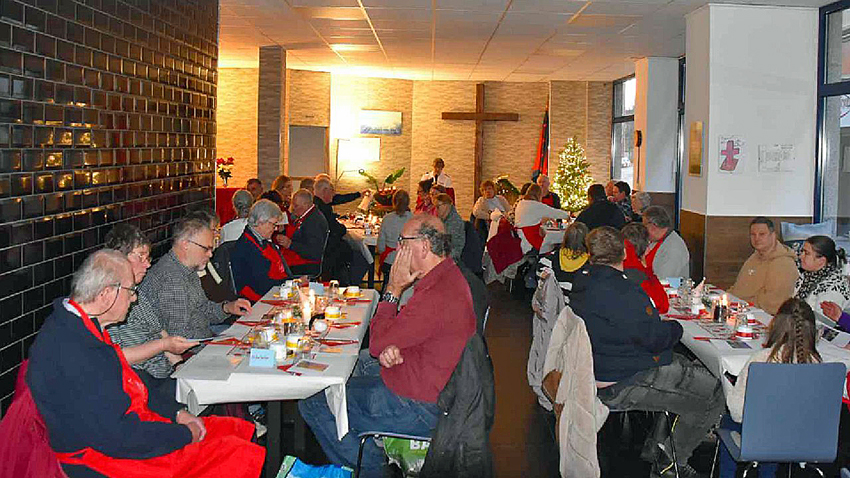 Der Nachmittag begann nicht etwa direkt mit dem Essen, sondern mit einem besinnlichen Rahmenprogramm. Klassische Weihnachtslieder, die von den Gästen textsicher mitgesummt und gesungen wurden, wechselten sich mit kurzen Gebeten und Impulsen ab. Diese bewusste Gestaltung verlieh der Veranstaltung eine Würde, die über eine reine Essensausgabe weit hinausging. Dank der Unterstützung von Sponsoren war es möglich, den Gastraum in ein weihnachtliches Wohnzimmer zu verwandeln, in dem jeder Gast einen festlich gedeckten Platz vorfand.