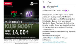 Wer die Social-Media-Kanäle des VfL in den Tagen zuvor verfolgte, stieß auf einen Werbepost des Wettanbieters Tipico, Werbepartner der 3. Liga. „VfL Osnabrück KLUB BOOST!“ war dort zu lesen. Für einen eingesetzten Euro gab es bei einem Sieg des VfL 14 Euro zu gewinnen. Für alle, die sich richtigerweise von Sportwetten fernhalten oder deren Metier nicht die Mathematik ist: das ist eine absurd(!) gute Quote, vor allem für den Favoriten.